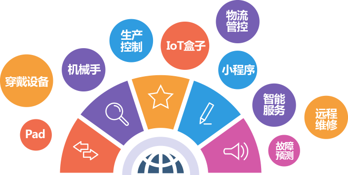 通過Pad、機(jī)械手、穿戴設(shè)備、IoT盒子、RFID、小程序等方式做生產(chǎn)控制和物流管控,同時(shí)提供智能服務(wù)、故障預(yù)測(cè)、遠(yuǎn)程維修。